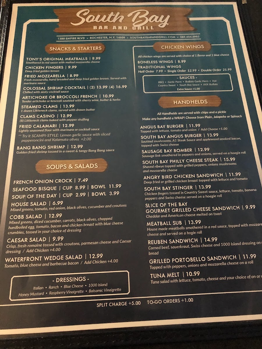 At South Bay Bar & Grill, located on Empire Blvd in Rochester, we blend comforting flavors with a welcoming atmosphere. Our story begins with a commitment to quality, evident in our signature dishes like slow-roasted Beef on Weck and crispy Chicken Wings, paired with delectable sauces. Feedback speaks volumes; patrons rave about exceptional service and unforgettable meals, whether it's our Chicken French or succulent lobster tail. Nestled near the bay, our environment invites both families and friends to gather and enjoy a memorable dining experience. Join us at South Bay Bar & Grill, where every meal feels like home.